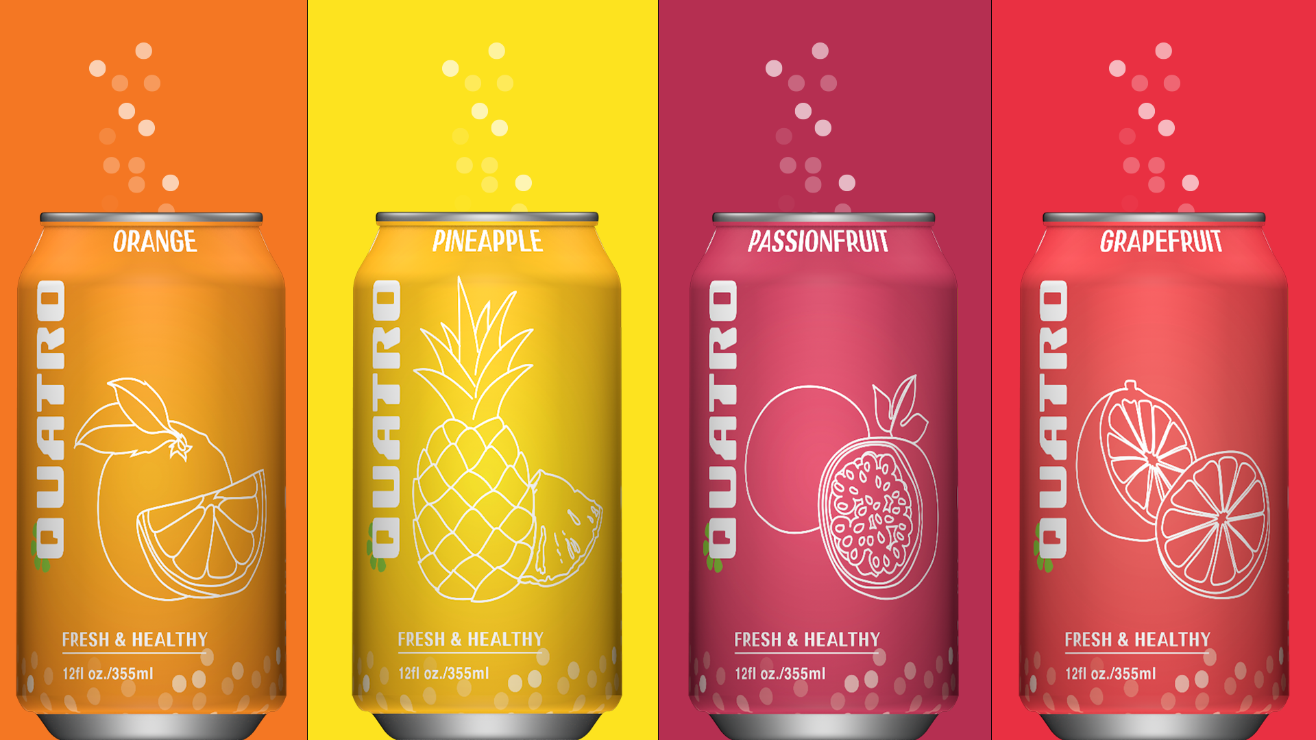 Collaborative work on a rebranding for Quatro, a soft drink brand.